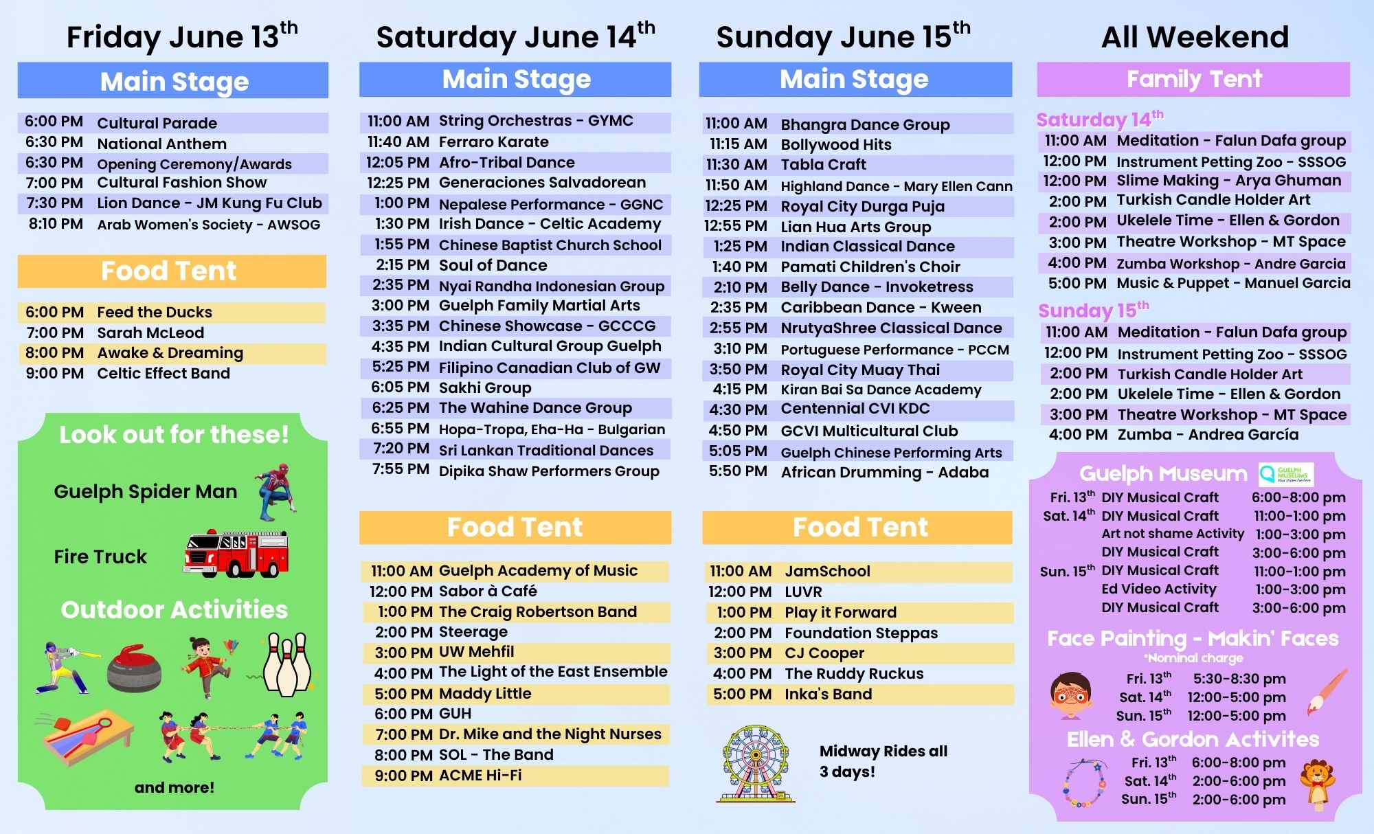 Fathers day is around the corner and there are tons of cool events in the city this weekend led by the Guelph Multicultural Festival at Riverside Park with lots of food vendors and activities! See below for an image of vendors and activities.